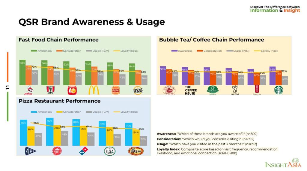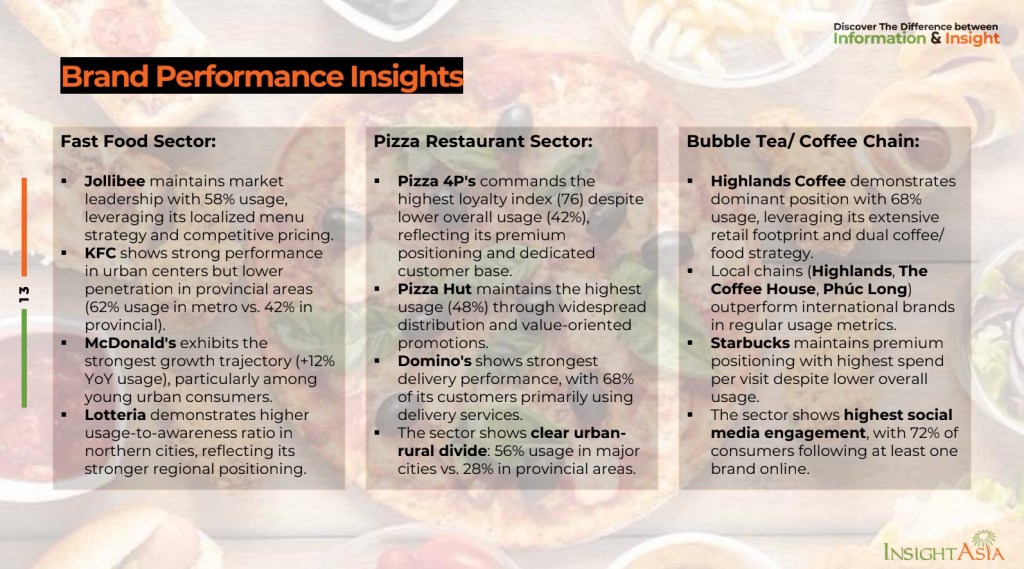 Với fast food, Jollibee dẫn đầu với 58% usage nhờ menu nội địa và giá hợp lý. McDonald’s tăng trưởng mạnh nhất với 12% nhưng vẫn gặp khó khăn trong việc kết nối cảm xúc với khách hàng. Các thương hiệu nước ngoài cần có yếu tố nội địa mạnh hơn, không chỉ về món ăn mà còn về hình ảnh và trải nghiệm nếu muốn giữ chân khách hàng Việt